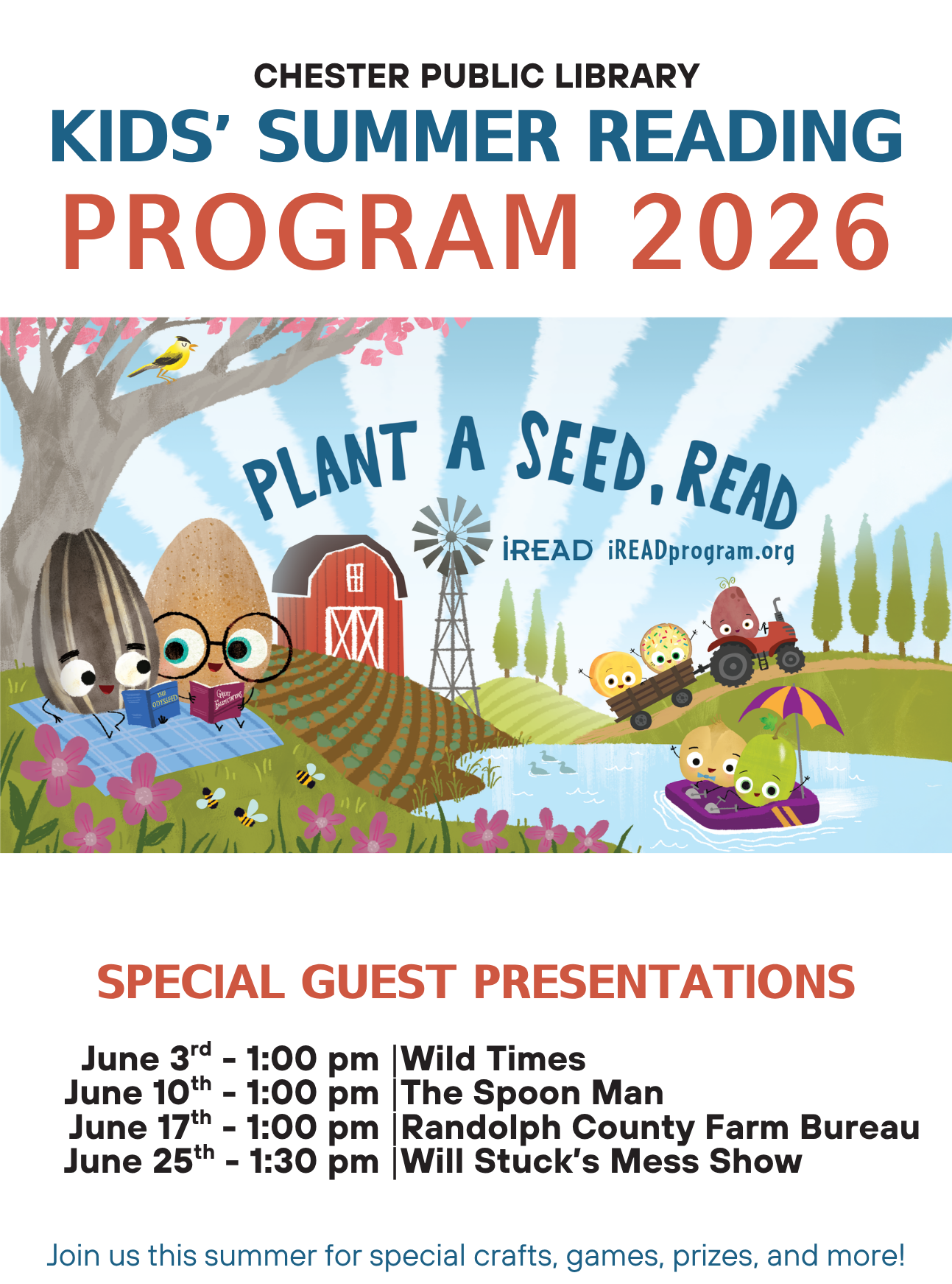 Submission Portal Link B&W Submission Email: bw-chesterpubliclibrary@eprintitsaas.com Color Submission Email: color-chesterpubliclibrary@eprintitsaas.com Upcoming Events Apr 30 10:00 am – 5:00 pm ROE 45 GED Classes Apr 30 5:30 pm – 7:00 pm Teen Reading Club May 5 10:30 am – 11:30 am Lap Sit Story Hour May 5 6:00 pm – 7:30 pm Evening Book Discussion: Happiness Falls May 6 9:00 am – 2:00 pm Basket Weaving Class: Patriotic Basket May 7 10:00 am – 5:00 pm ROE 45 GED Classes May 9 11:00 am – 12:00 pm Forest Park Owls: Hiding In Plain Sight May 12 10:30 am – 11:30 am Lap Sit Story Hour View Calendar