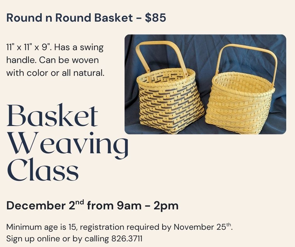 Round n Round, $85, 11″ x 11″ x 9″. Has a swing handle. Can be woven with color or all natural.