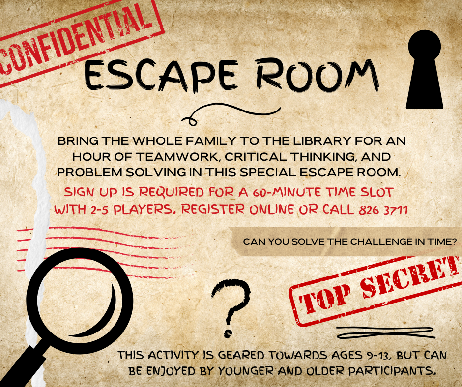 Bring the whole family to the library for an hour of teamwork, critical thinking, and problem solving in this special escape room. This activity is geared towards ages 9-13, but can be enjoyed by younger and older participants. Sign up is required for a 60-minute time slot with 2-5 players. Can you solve the challenge in time?