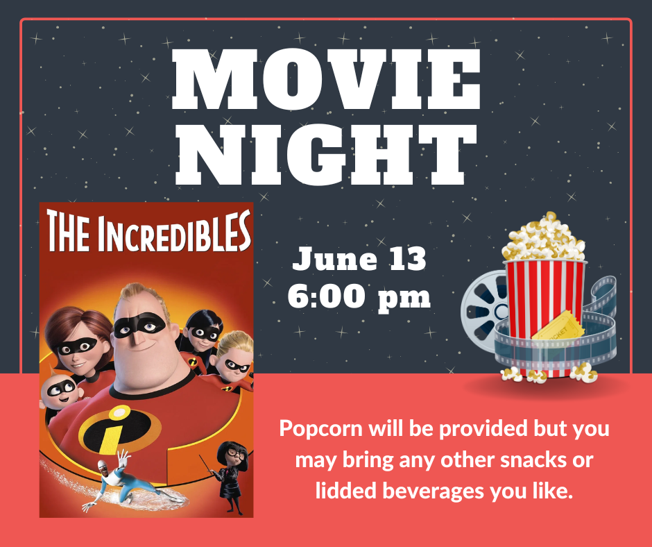 Celebrate National Movie Night with family and friends at the library for a viewing of "The Incredibles." (rated PG) Popcorn is provided. Feel free to bring a lidded beverage and additional snacks, if desired.