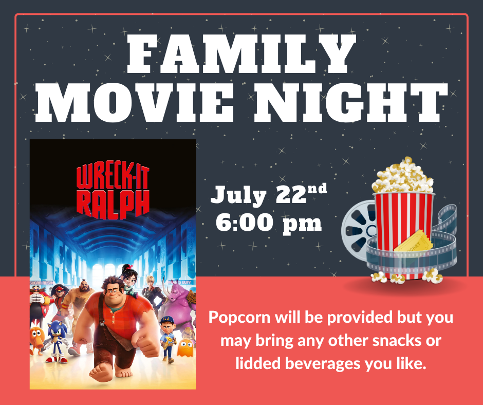 Join us for movie night where we will be showing "Wreck-It Ralph" Popcorn is provided, but you can feel free to bring your own lidded drink and other snacks.