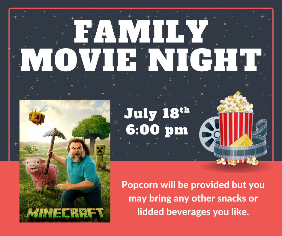Join us for movie night where we will be showing "Minecraft" Popcorn is provided, but you can feel free to bring your own lidded drink and other snacks.