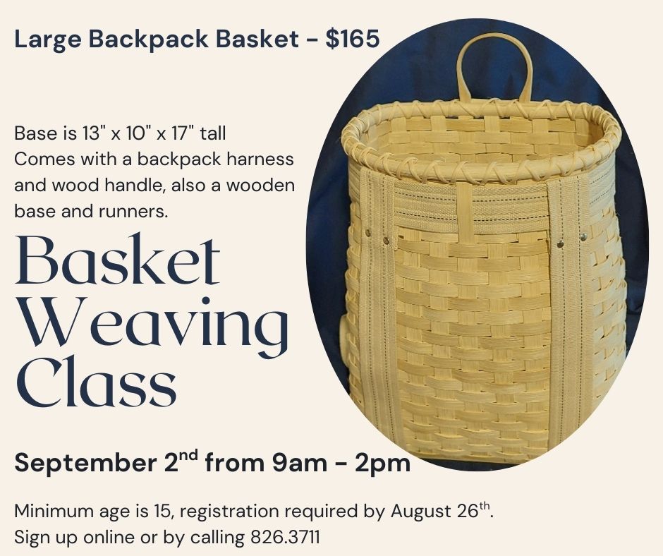Learn how to weave a large backpack basket, taught by Laura Klaus. All sizes are approximate and are measured to the top of the basket, not to the top of the handle. There is a minimum age of 15. Registration closes 1 week prior to class so that we have time to prepare the materials. ... Read more