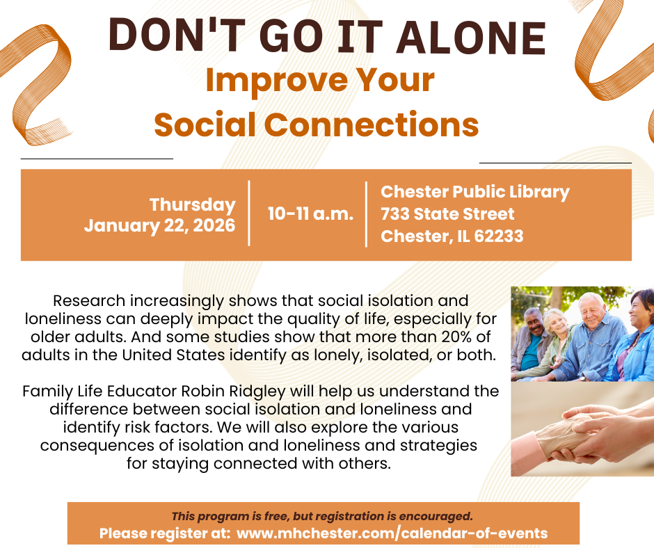 Presented by the U of I Extension and the Chester Memorial Hospital. Research increasingly shows that social isolation and loneliness can deeply impact the quality of life, especially for older adults. And some studies show that more than 20% of adults in the United States identify as lonely, isolated, or both. Family Life Educator Robin ... Read more