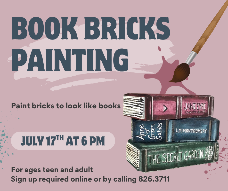 ![]() Join us to paint bricks to look like your favorite books. This activity is recommended for age teen and up. Registration is required. You can sign up below or call 826.3711
