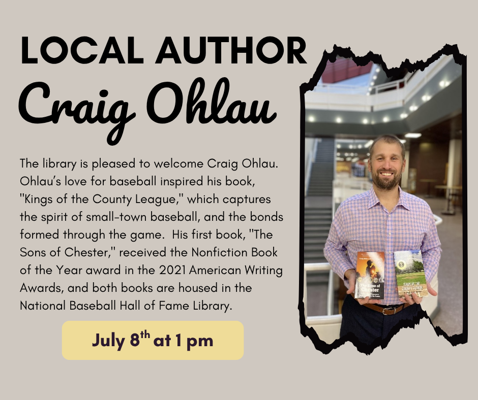 ![]() The library is pleased to welcome local author Craig Ohlau. Ohlau’s love for baseball inspired his book, "Kings of the County League," which captures the spirit of small-town baseball, and the bonds formed through the game. His first book, "The Sons of Chester," received the Nonfiction Book of the Year award in the 2021 American ... Read more |
