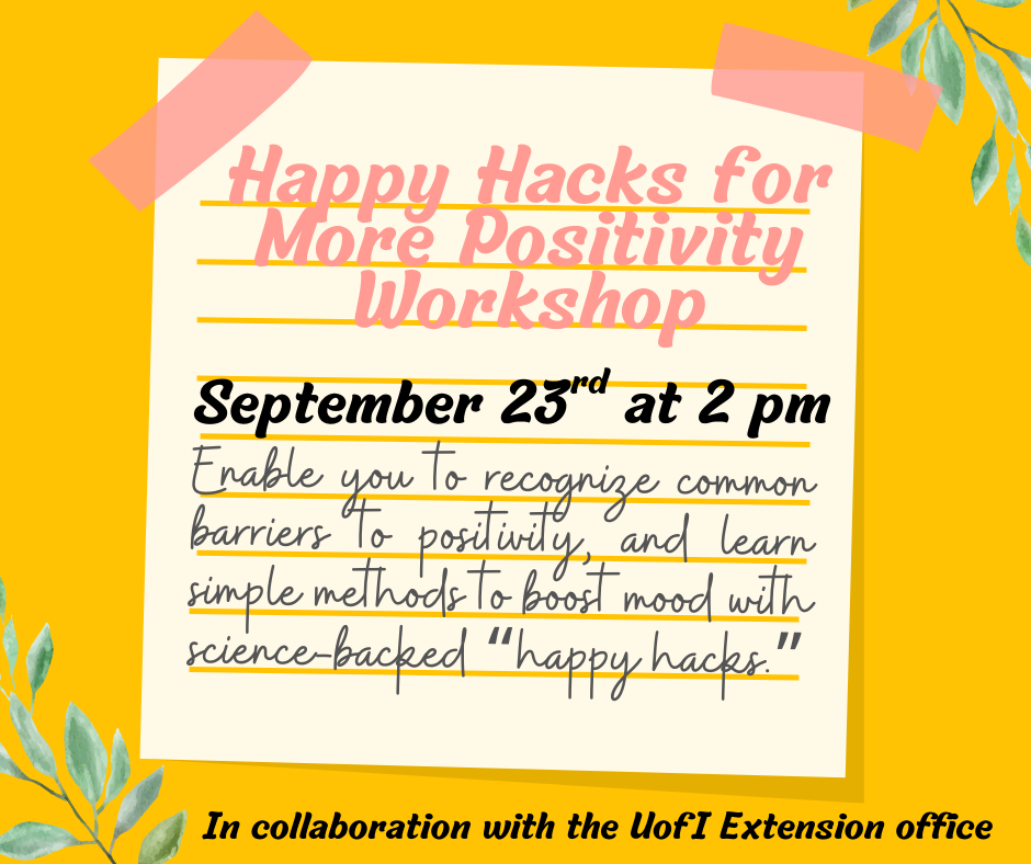![]() Presented in collaboration with the UofI Extension office, this workshop will enable participants to recognize common barriers to positivity and personal well-being, and learn simple methods to boost mood and positivity with science-backed "happy hacks." Registration is encouraged, but not required.