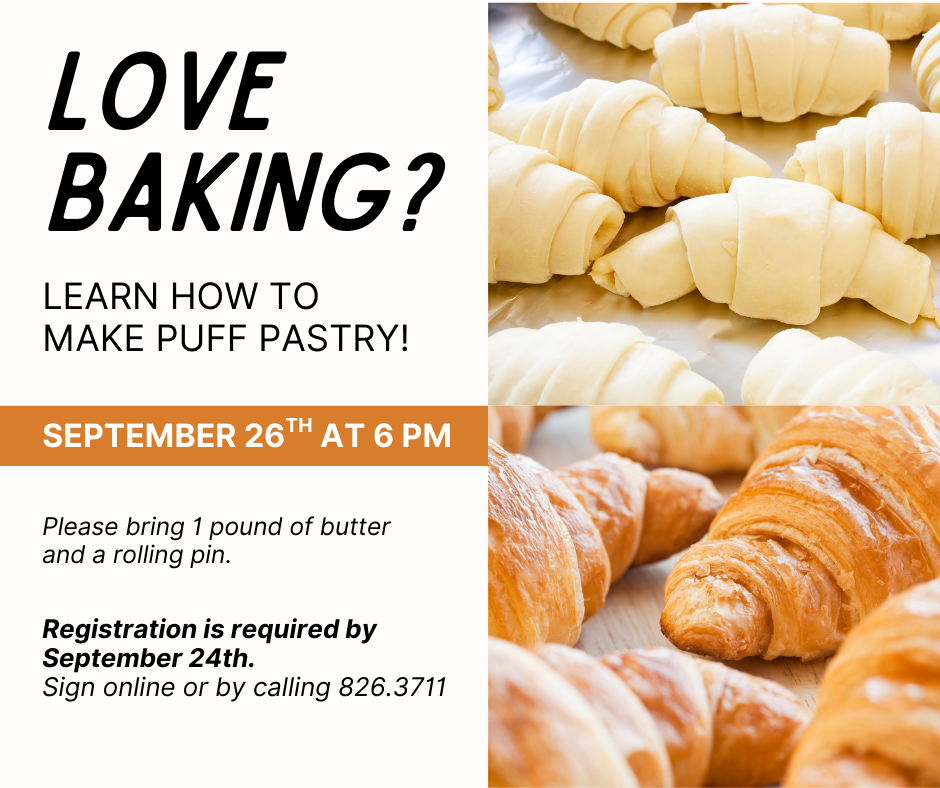 ![]() Learn how to make puff pastry for baking things such as strudel and croissants. Please bring 1 pound of butter and a rolling pin. Registration is required by September 24th. Sign up below or by calling 826.3711