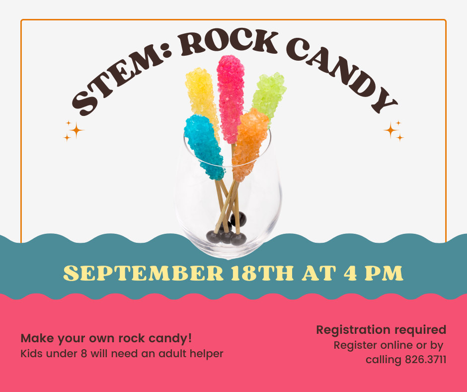 ![]() Make your own rock candy during this STEM program. Kids under 8 will need an adult helper. Registration is required by September 16th. Register below or by calling 826.3711
